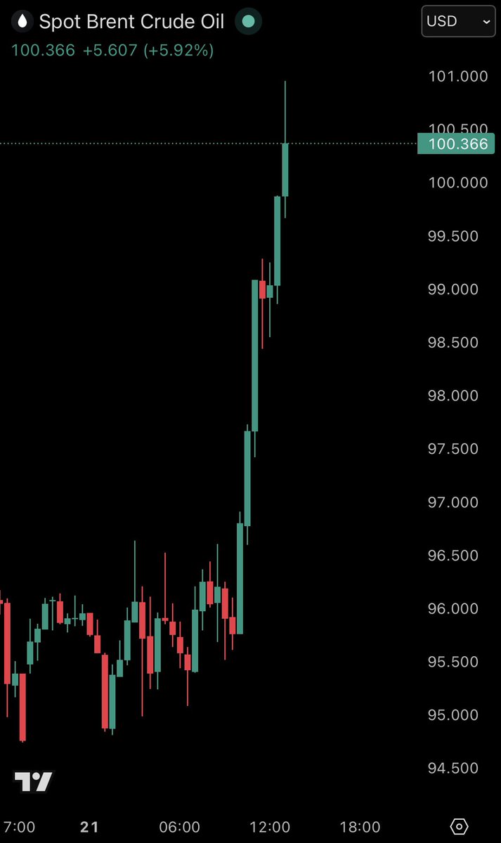 JUST IN: Brent crude oil prices surge above $100/barrel as US-Iran peace talks are paused.