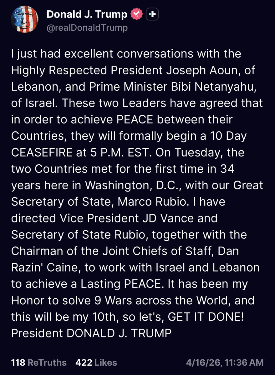 Срочное сообщение: Президент Трамп заявил, что 10-дневное перемирие между Ливаном и Израилем начнется сегодня в 17:00 по восточному времени.