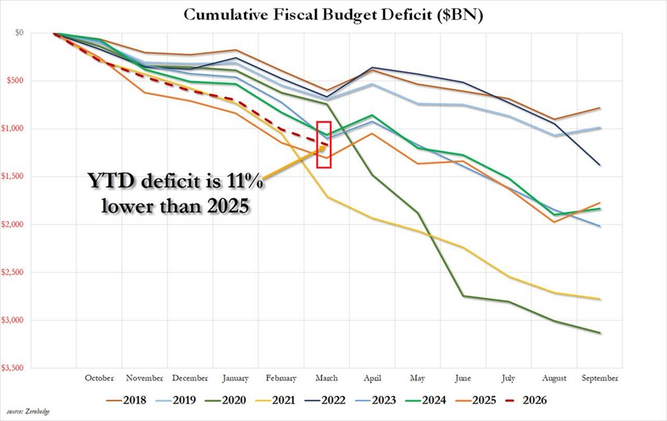 Между тем, военные расходы в марте выросли всего на +3% в годовом исчислении, достигнув 65 миллиардов долларов, что указывает на то, что расходы, связанные с войной с Ираном, еще не отразились на итогах, и предполагает, что будущий дефицит будет значительно выше.