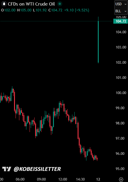 JUST IN: US oil prices officially surge +10% at the open, rising above $105/barrel, as peace talks between the US and Iran fail to reach a deal.