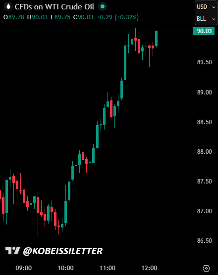 JUST IN: US oil prices surge back above $90/barrel as White House officials confirm that JD Vance has not departed for a second round of peace talks with Iran yet.